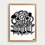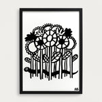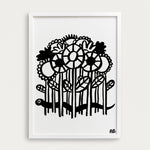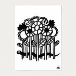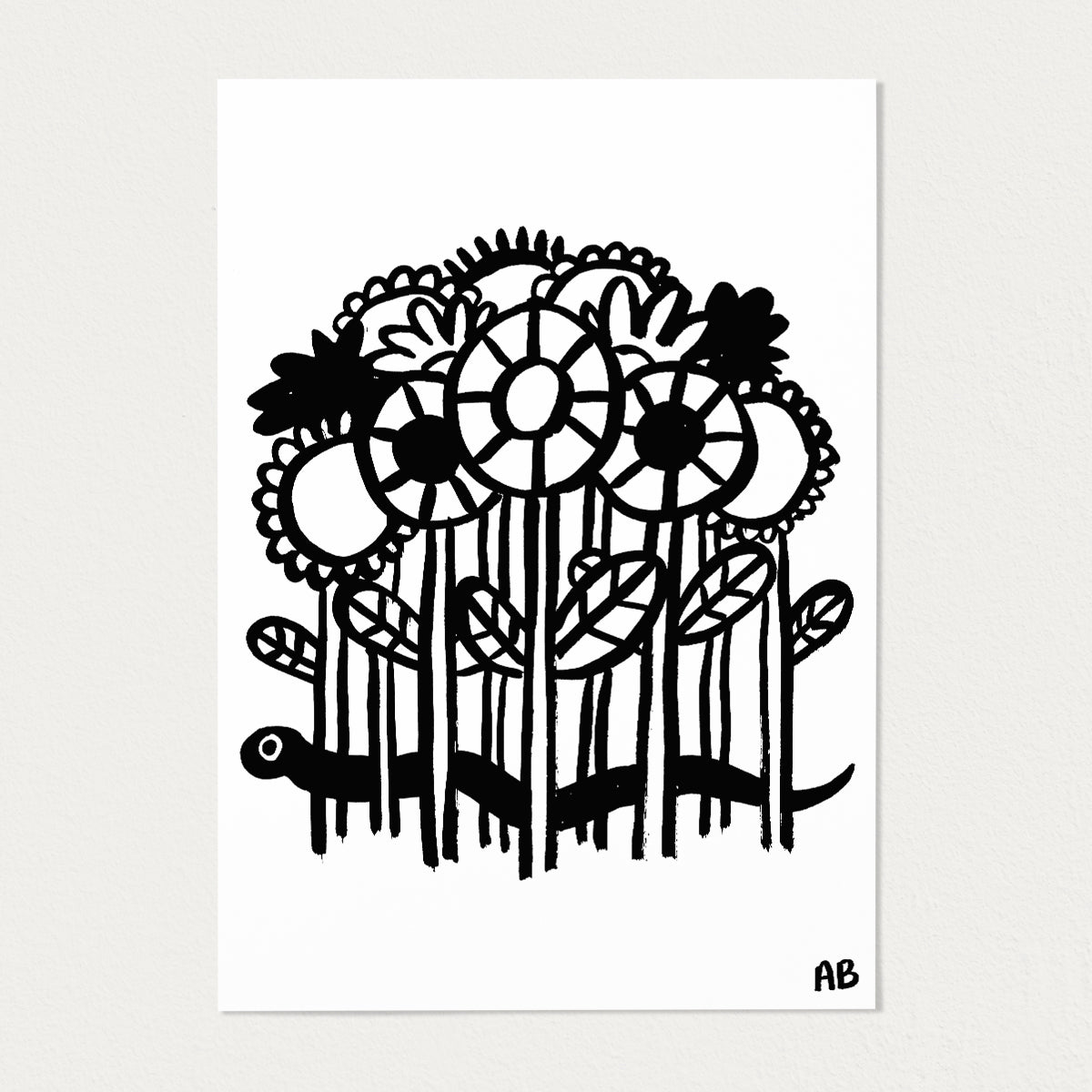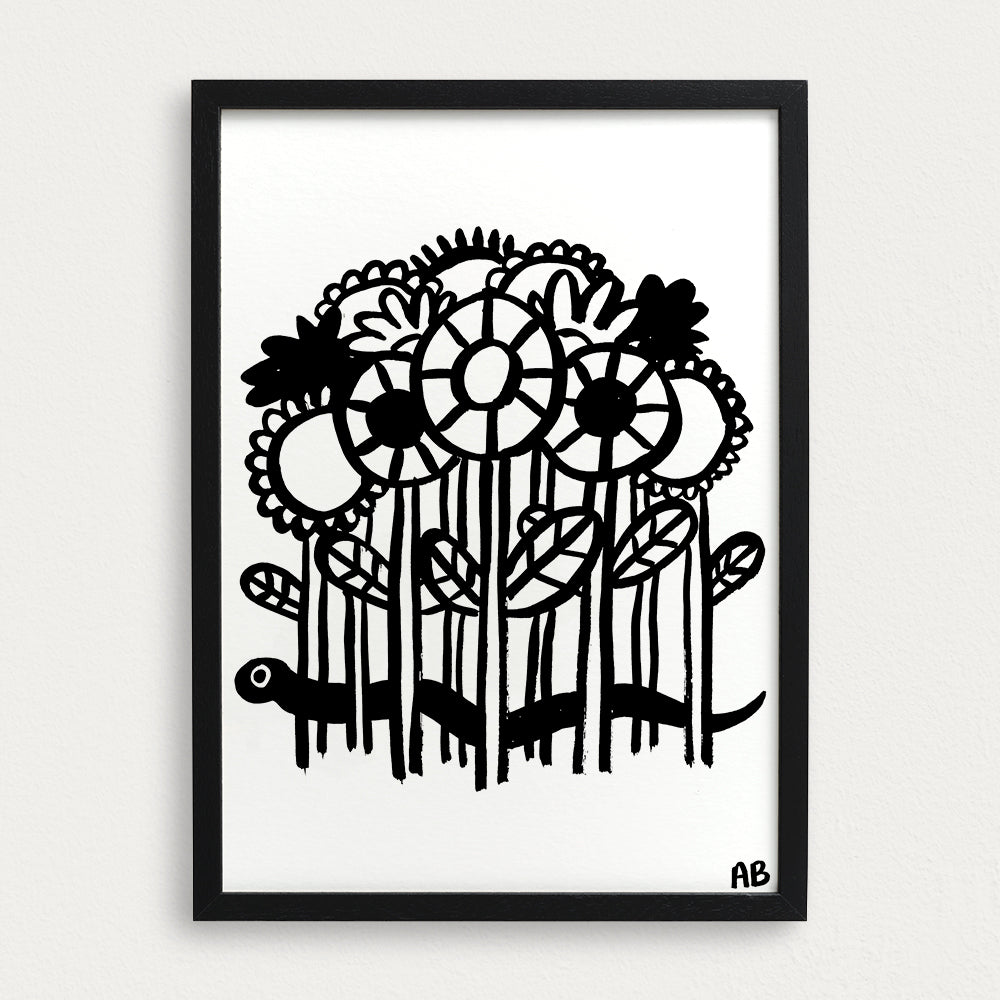 Spot the worm amongst the garden flowers. This cute monochrome print is created by artist and children's book author Alice Bowsher.