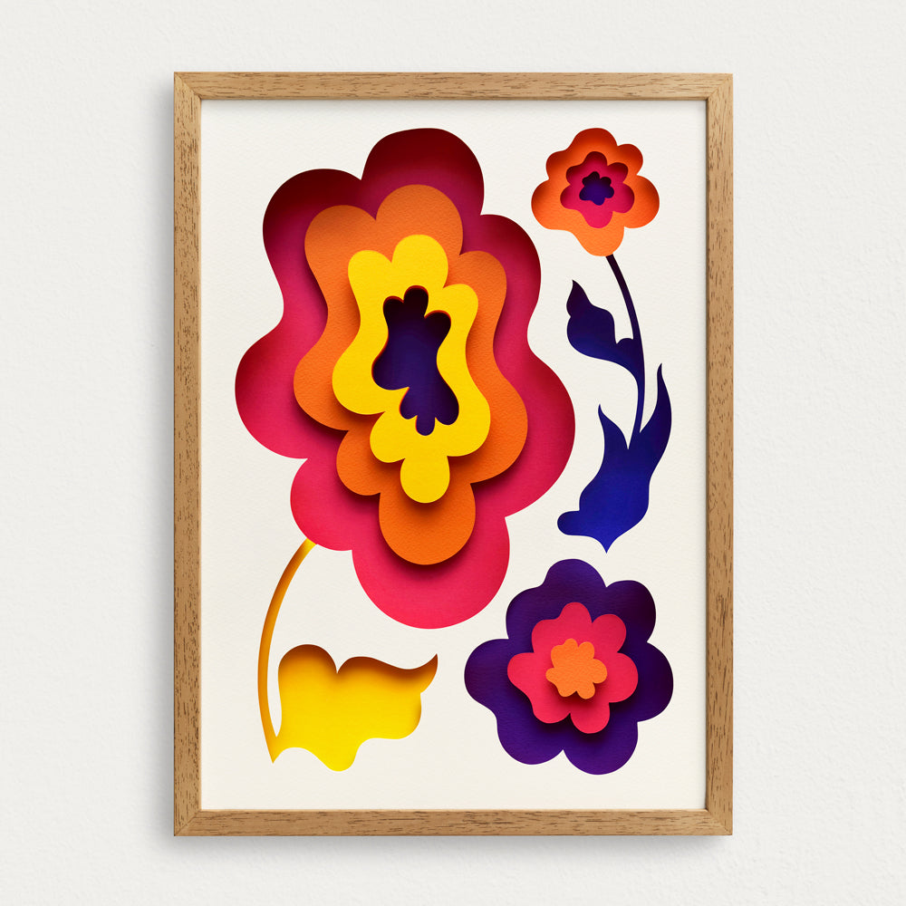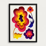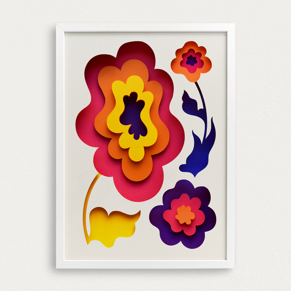 Bloom beautifully all year round! One of three bright and bold floral pieces created by artist Owen Gildersleeve. Original crafted by hand using layers of coloured paper.